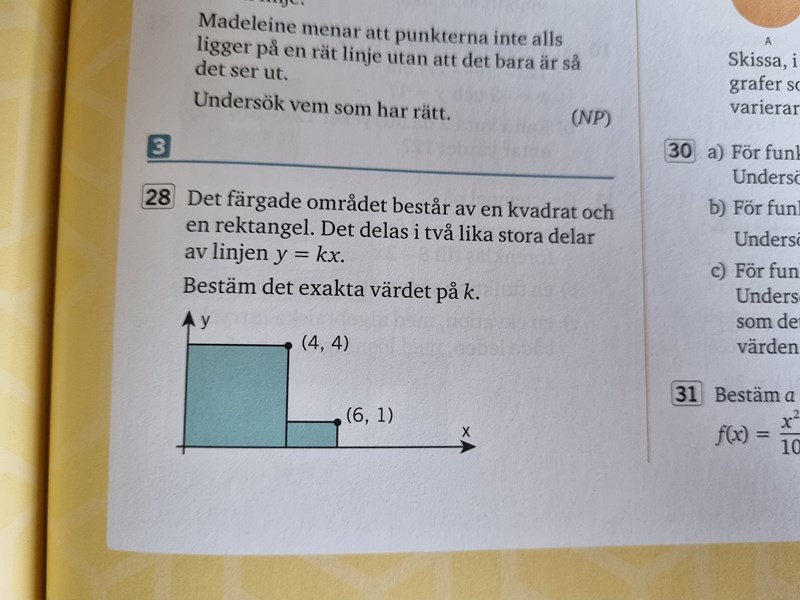 Tack för svaret. Jag tänkte att man behövde komma på en rät linje som skär y axeln vid 4 men det är ju fel eftersom man ska hitta en rät linje med formeln y=kx och inte y=kx+m. Nu tänkte jag att eftersom vi vill dela kvadraten i två trianglar, som du skrev, så måste ju en vara 9 a.e och en 7 a.e eftersom den lilla adderas med rektangeln som är 2 a.e. Vi vet att den lilla triangelns area ska vara 7 a.e och att triangelns area är A=(b*h)/2 där b=4 och A=7 dvs 7=4h/2. Det blir 7*2=4h -> 14/4=h -> 3.5=h dvs k=3.5/4