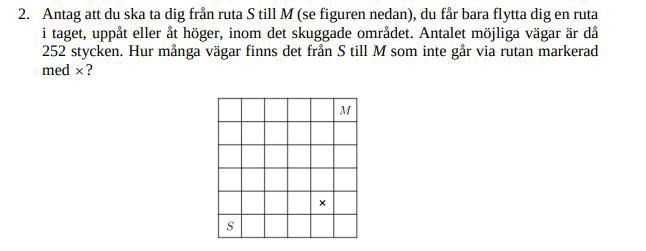 Skaft skrev:Det "skuggade området" måste betyda hela figuren, dvs. du får bara gå inom rutnätet. 252 vägar blir det nämligen om man har hela rutnätet att gå på.