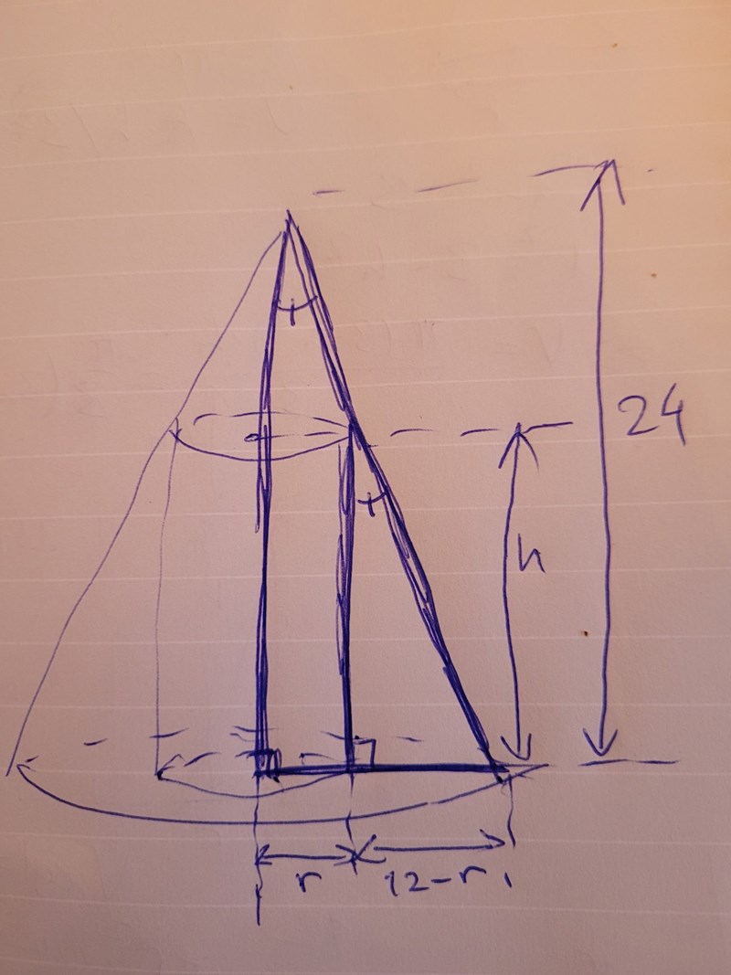 Börja med att konstatera att om radien för cylindern är r, så är h =24-2r. Skriv volymen som en funktion av r, derivera och så vidare.