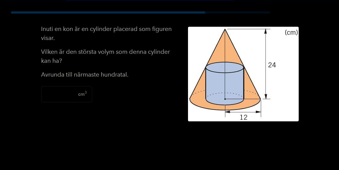 Skulle man med hjälp av trigonometri, räkna ut vinkeln på toppen i ett två dimitionelt perspektiv, som en triangel, Sedan skapa en ekvation, som beteer sig som en parabel, med hjälp av vinkeln. Sedan tänka sig cylinder i 2d, som en rektangel, och att den har två hörn fäst vid linjen, och två nedre hörn vid r axeln, Då vet vi att den undre sidan är 2r lång, och längden är h värdet på ekvationen, då ersätter vi bara r i h form, sedan deriverar vi efter maxim-punkten på ekvationen, där ifrån får vi vårt h värde, sedan sätter vi in det värdet i vår formel och får även tag på r värdet. Sedan tar vi r^2*pi*h, får ut största möjliga volymen?