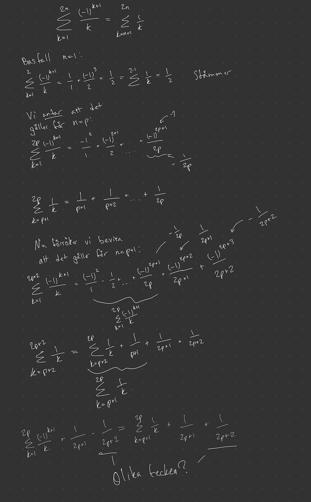 Detta tycker GPT håller för induktionsbeviset trots olika tecken. Någonting om att summans termer skiftar tecken och att något händer då man sätter p+1. Men förstod inte riktigt. Någon som som skulle vilja förklara?