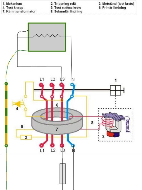 En sak jag inte ritat in i kopplingsschemat är att någonstans i någon elcentral innan denna installation så är N och skyddsjord ihopkopplade. Tänk dig en ledning längst ner mellan ändarna på N och skyddsjordsledaren.