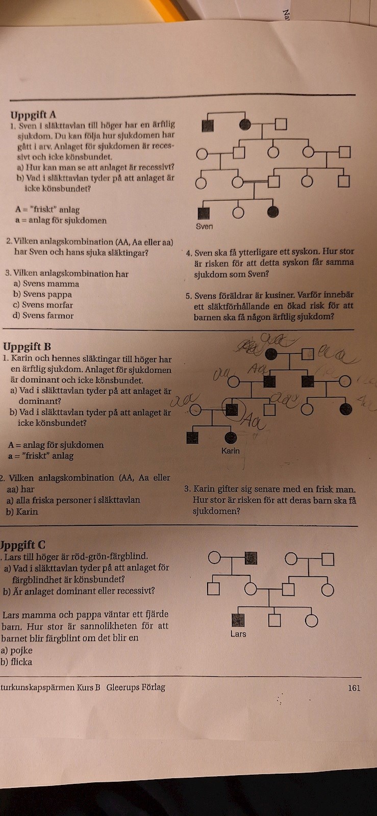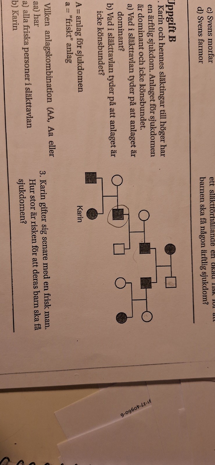 Är det ett recessivt anlag är det vanligare med en eller flera generationer där inga individer är sjuka (sjukdomen kommer bara när barnet är homozygot för det recessiva sjukdomsanlaget) - motsvarande hur det ser ut i uppgiften A. Där kusinerna (Svens föräldrar) båda måste ha ett sjukdomsanlag. Och i Svens generation blev två syskon sjuka (homozyogt för sjukdomsanlaget) och den ena av Svens systrar är antingen heterozygot med ett sjukdomsanlag, eller så har hon två friska anlag.