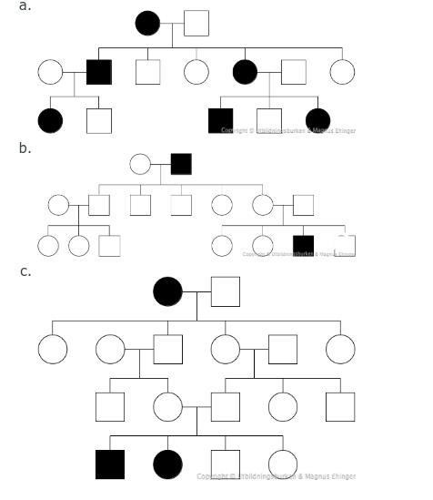 Förstår inte riktig hur man utifrån en släkttavla kan säga att ett anlag är dominant? Fattar att om ett anlag är dominant måste det bli synligt i varje generation för att föras vidare men bara för att ett anlag är synligt i varje generation betyder det väl inte till 100% att anlaget är dominant? Kolla tex på bilden nedan släkttavla A, borde inte egenskapen som är svart markerad kunna vara både dominant och recessiv?