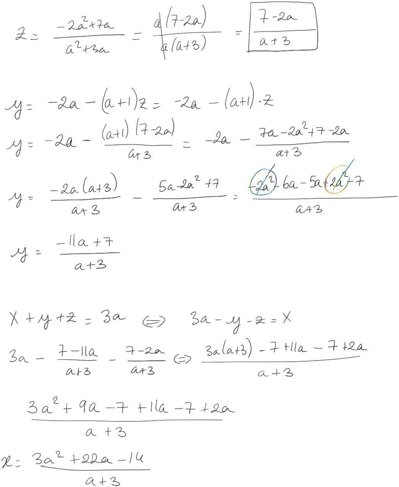 Tänk också på att a måste vara skilt från 0 när du delar med a på båda sidor, samt att a måste vara skilt från -3 för att du ska få använda dina lösningar. För a=0 (determinanten 0 och homogent system=>> oändligt många lösningar) måste du utreda situationen separat.