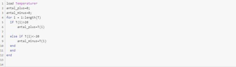 Filen Temperaturer.mat innehåller en vektor T med ett antal uppmätta temperaturer. Skriv en Matlab-kod som går igenom vektorn och kontrollerar hur många av de uppmätta temperaturvärdena som är högre än +20 grader och hur många som är lägre än eller lika med -20 grader. Antalet värden som är större än 20 ska lagras i variabeln antal_plus och antalet som är lägre än -20 ska lagras i variabeln antal_minus. Du ska använda en for-slinga och en if-sats när du löser uppgiften.