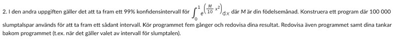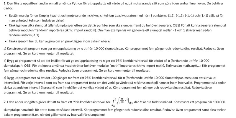 Program 1a) är korrekt, men resten fick jag retur på och lärare sa att det enklast att tänka att jag ska ta fram ett konfidensintervall för hur stor del cirkelns area är av kvadratens area och sedan multiplicera hela intervallet med 4 för att istället få ett konfidensintervall för pi, och att jag ska försök använda motsvarande metod i uppgift 2.