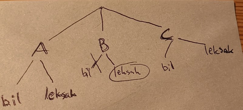 Sen får vi reda på att B har en leksak bil bakom sig.