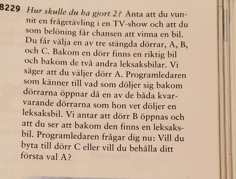 Smaragdalena skrev:Du har valt dörr A. Det finns fyra möjligjeter: