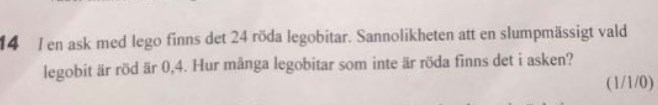 Jag tänkte att man kan ta 0,4 = 40% 24=40% 24/2=12 12=20% 20x5=100 så 12x5=60 o sen 60-24 är hur mycket som finns i asken?