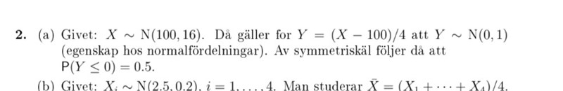 I bild 1 syns själva uppgiften och i bild 2 finns lösningen. Hur fås N(0,1)? Vad menas med "egenskap hos normalfördelningen"? och "av symmetiskäl följer då..."