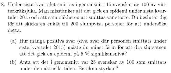 Låt beteckna sannolikheten att en enskild svensk medborgare får vinterkräksjuka under det sista kvartalet år 2015. Du vill testa nollhypotesen mot den ensidiga alternativhypotesen .