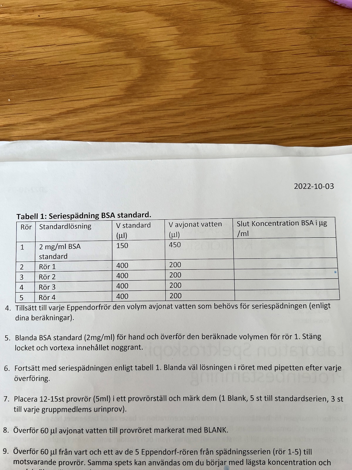 Instruktionen visar en spädningsserie, som behöver göras för experimentet. Det går m.a.o. inte att mäta direkt på standardlösningen med koncentrationen 2mg/ml.