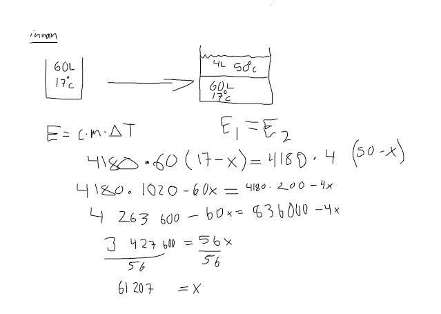 En morgon när isabella vaknar är det kallt hemma. För att rädda livet på sina akvariefiskar häller isabella i 4L 50*C vatten. Vilken temperatur får blandningen om akvariet från början var innehåller 60L vatten med temperaturen 17* C.