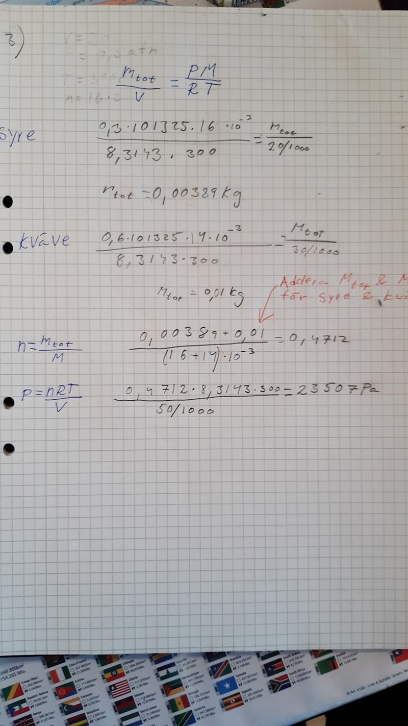 Syrgas: n = 101 325.0,3.0,02/(8,314.300) = 0,2437 mol