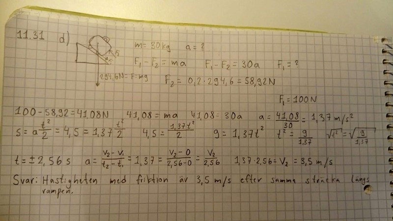 Nu undrar jag bara på d) uppgiften en grej, för jag har dubbelkollat och använt massa decimaler. Fast kan inte få svaret till 3,4 m/s (i facit står det "4 m/s (3,4 m/s)"). Om jag skulle avrundat uppåt skulle jag fått 4 m/s. Fast fattar bara inte hur de fick det mer exaktare värdet (för det är väl vad det är) till 3,4 istället för 3,5 m/s?