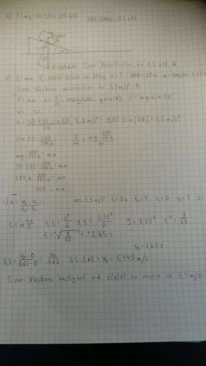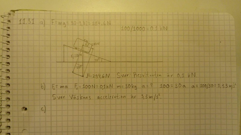 c) Då får jag upprepa mig. Det finns ingen summa av krafter. Det är bara kraftkomposanten av "mg" utmed det lutande planet, som ger lådan dess acceleration.