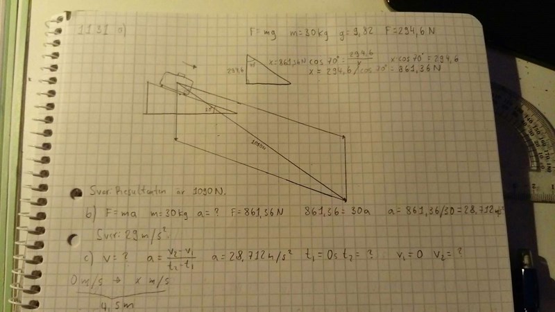I c)-uppgiften konstaterar man att det handlar om en likformigt accelererad rörelse (dvs accelerationen längs backen är konstant) och använder någon av formlerna för detta för att bestämma hastigheten efter 4,5 meter sträcka.