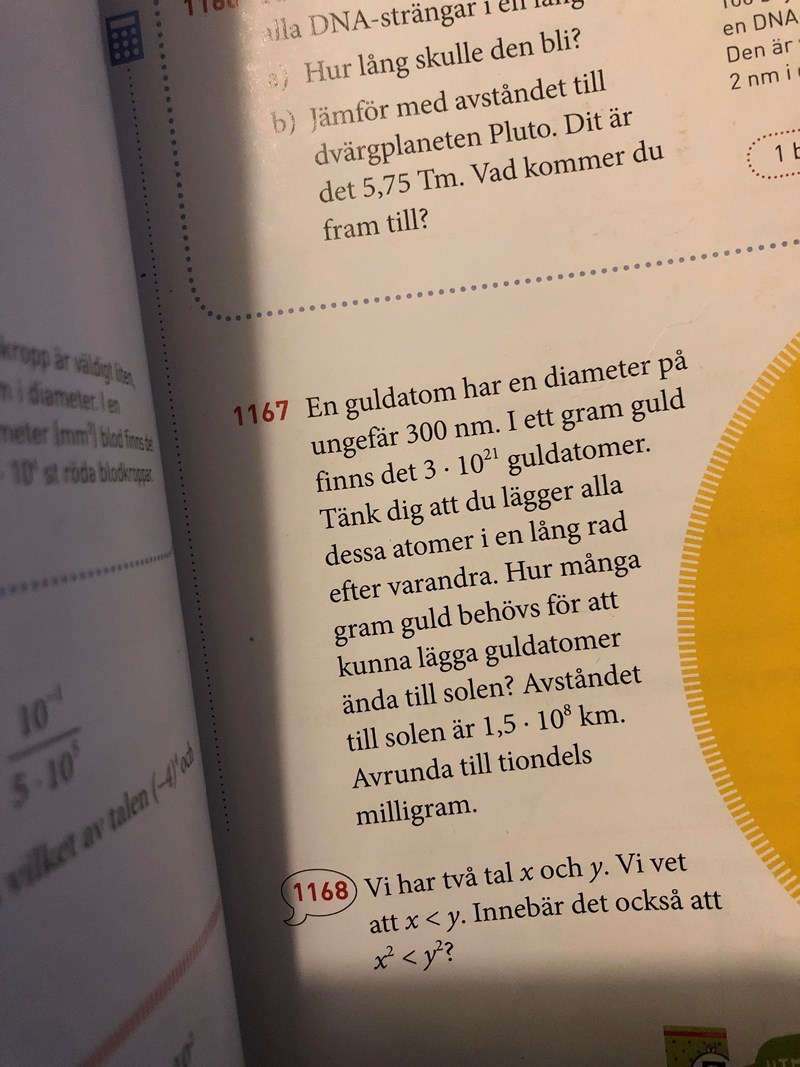 jag behöver hjälp med uppgift 1167. Så jag fått fram att en guldatoms diameter är: 3 • 10^(-7) (minus sju istället för minus nio eftersom det var 300 nanometer och inte bara 3). Sen multiplicerar jag det med hur många guldatomer det finns på ett gram (3 • 10^21). Jag får 3^14. Sen delar jag det på 10^3 för att få det i kilometer vilket blir 3^11. Men vad gör man efter? I facit står det 0.2mg