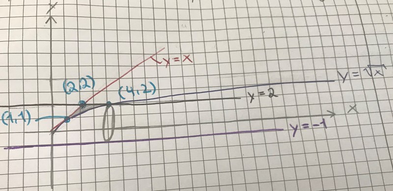 I detta fall kommer arean att vara skillnaden mellan två cirklar, . Du måste ta reda på vad och är uttryckt i , och sedan integrera. Observera att eftersom det är olika funktioner som begränsar området uppåt till kan du behöva dela upp i flera integraler.