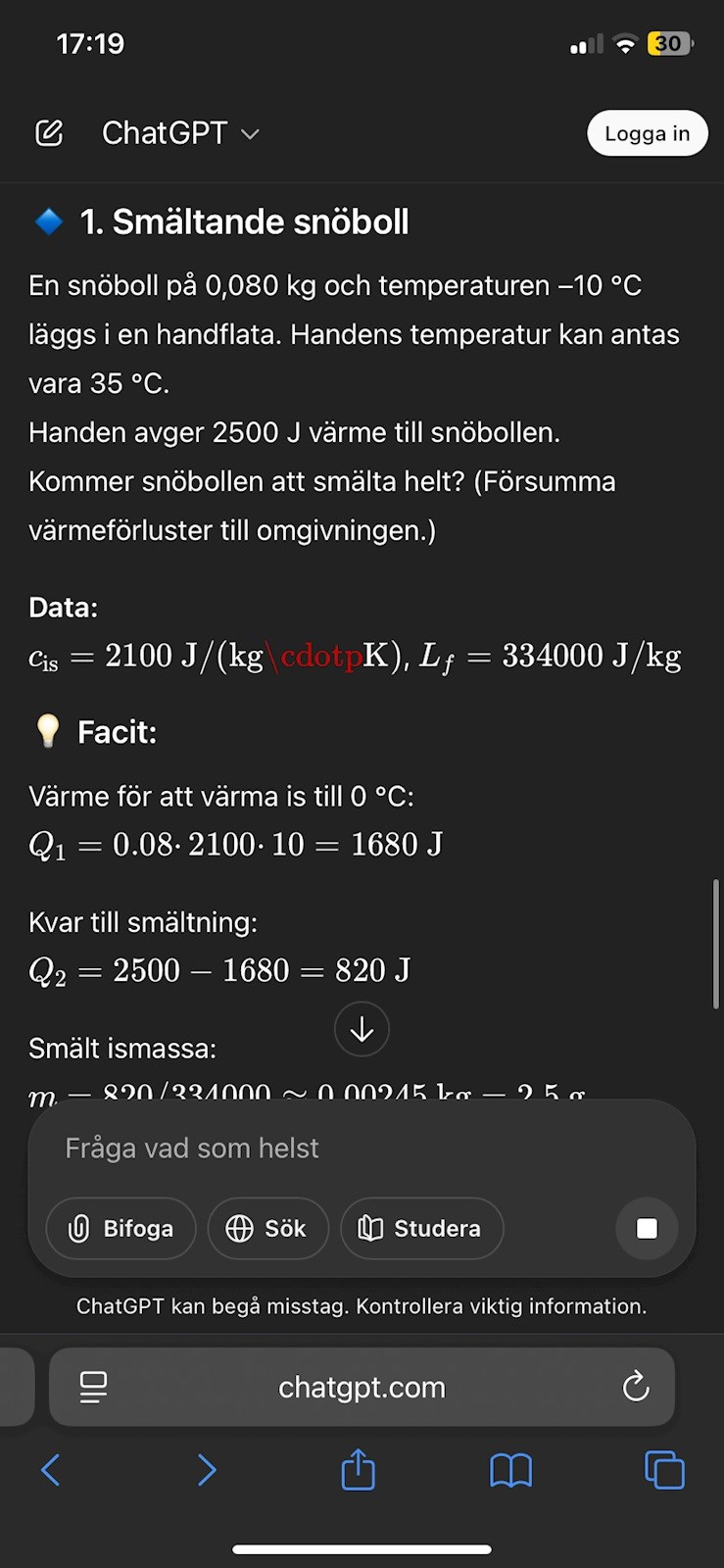Men! Det är ett problem här som man kan inse om man hållit en snöboll i handen. Kommer hela snöbollen att värmas upp till 0 C innan någon liten den av den smälter? Nej, du blir ju blöt nästan omedelbart eftersom snön närmast handen tinar mycket snabbare än den längst in. (Säkert är uppgiften förenklad, men jag tycker ändå det är lite trist när man tar bort väsentliga aspekter av fysiken.)