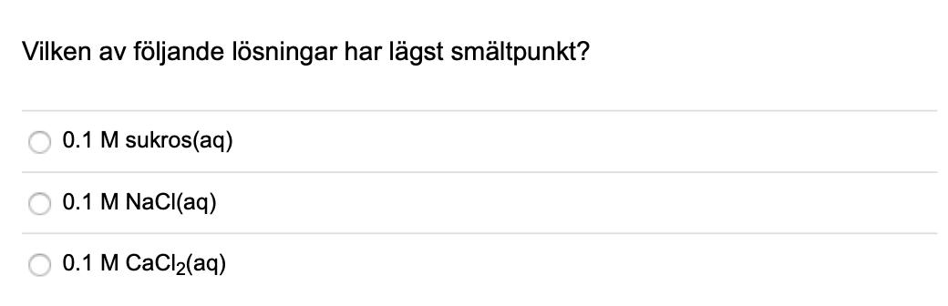 Ja, men man kan se det ganska direkt utan att räkna vilket sparar tid på t.ex. en tenta. Kalciumklorid sönderdelas i flest partiklar och eftersom totalkoncentrationerna är lika i de olika fallen kommer denna lösning då få lägst smältpunkt.