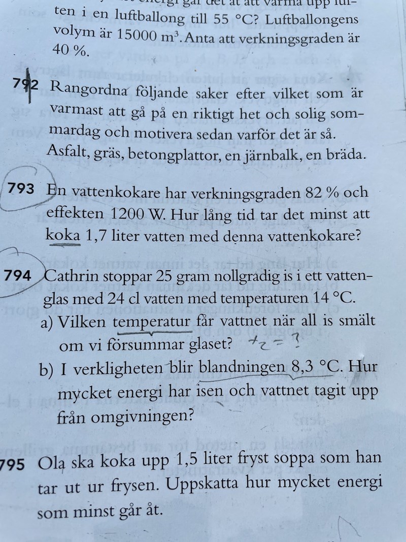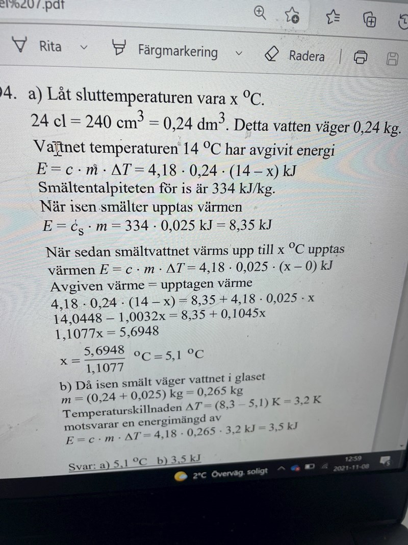 förstår liksom inte processen. Så först lägger man is i vatten, och vattnet kommer avge en värmeenergi som man räknar ut med E=cmdT för att isen ska smälta. Och vattnet kommer då bli kallare därför räknar man ut (14-x) Och sedan kommer isen att börja smälta, och då räknar man ut den energi som behövs för att smälta isen med formeln E= l * m. Och sen kommer isen och vattnet ha blandats, men det står att ”smältvattnet värms upp”, vad menar de med det? Tänker väl att den kommer bli kallare. Iallafall, sedan räknar de då ut den värmeenergin som som upptas av smältvattnet E=cmdT, men de tar c= 4.18 (som är vattnets kapacitet) men isens massa? Hur vet man att man ska blanda isens massa och vattnets kapacitet, vanligtvis tar man typ isens kapacitet och dess massa, inte två olika ämnen? Och hur kommer det sig att temperaturen blir (x-0) vad har isens temp med grejen o göra?