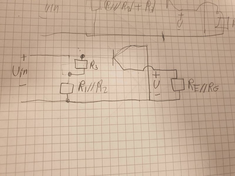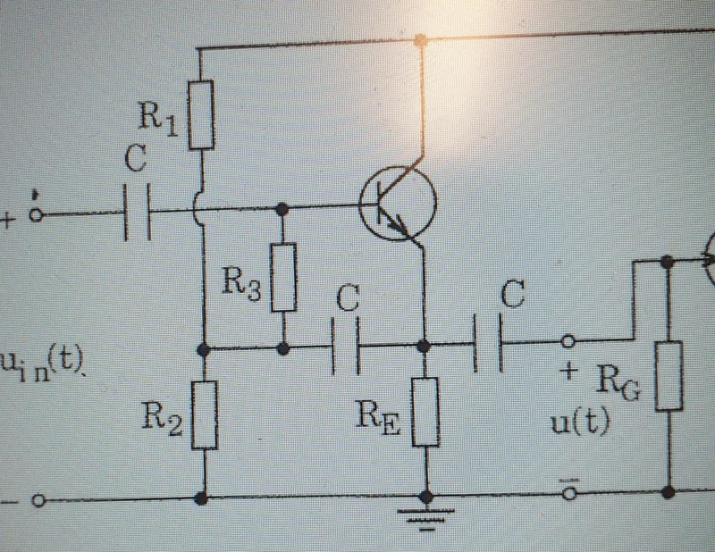 Så r1 //r2 går in i basen? O re//rg går ut från emittern? Ska jag ignorera r3 helt när jag ritar signalschemmat eller är r3 seriekopplat med r1//r2? Re är ju kopplat till jord o C blir den kortsluten då potentialen I jord o C är 0?blir de bara rg ut från emittern isåfall?