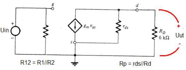 detta blir rätt småsignalschemma. Men funderar på hur jag ska få ut u. Vet ju inte vilken ström som går genom parallelkoppningen. Men går det o använda spänningsdelning?