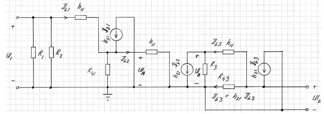 Transistorsteget i mitten fasvänder signalen 180 grader, så jag undrar om polariteten vid h21xIb2 är rätt?