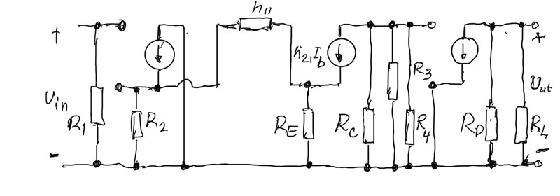 Jag undrar vad Uin är vid första förstärkarsteget. Är det U_in= U_GS1 + g_m*U_GS1(h_11*R_2 /(h_11+R_2))+ I_b(h_21-1)R_E