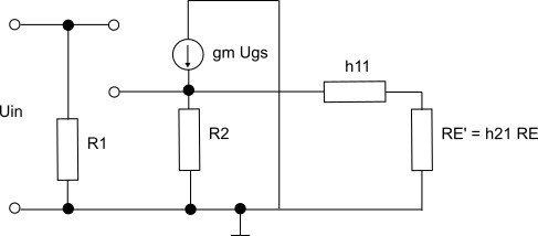 Är då Uin= UGS1 + gm*UGS1(1/R2+1/(h11*RE/(h11 + RE)))