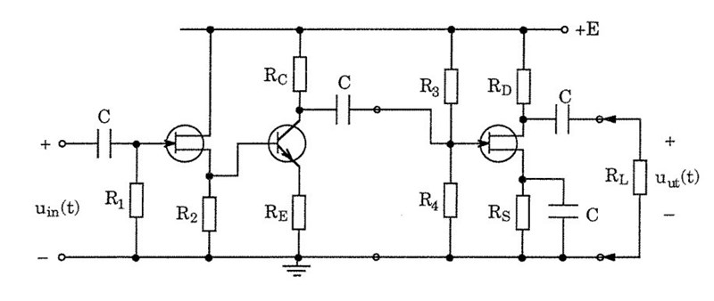 Beräkna R3,R4,RD,RS så att fet-transistorn i det andra förstärkarsteget för arbetspunkten IDQ=5 mA, UDSQ6V. Fet transistorns gatepotential ska vara 3V. FET-transistorförstärkningen får inte sänka späningsförstärkningen som det första steget ger med mer än 0.5%