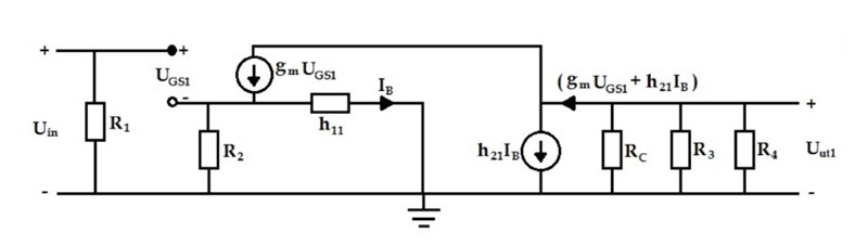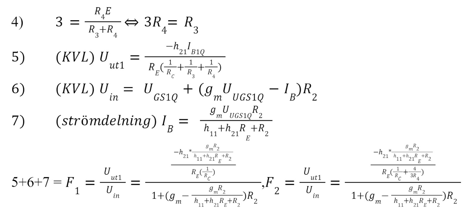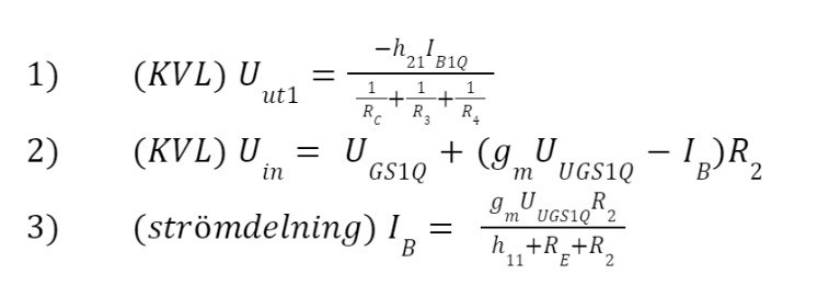 beräknade även att Uut= -gm*UGS1 - h21*Ib / (1/Rc + 1/R3 + 1/R4)