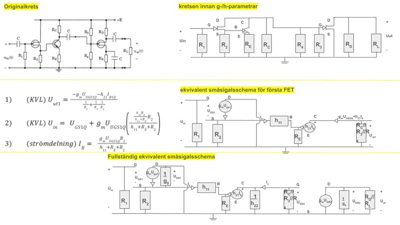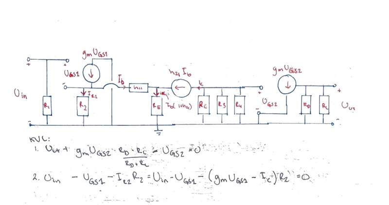 Hej igen, jag har tydligen fel grundekvation, dvs Uin och/eller Uin och/eller Ib utifrån fel småsignalsschema eller t.o.m. kan förenklas?? Jag har sett över det och undrar där med om alla kretsar nu är rätt, speciellt fullständigt ekvivalent schema, första FET och motsvarande ekvationer är rätt för att beräkna förstärkning, jag kan inte se felet. Uppdaterade med en bild på vad jag tror ekvationerna ser ut nu