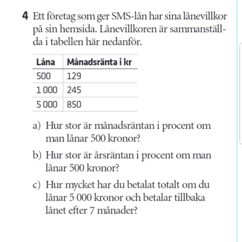 På 4b har du fått fram en årsränta på 1470 %. Nog för att SMS-lån är illa, men så hög ränta är ju omänskligt ;)