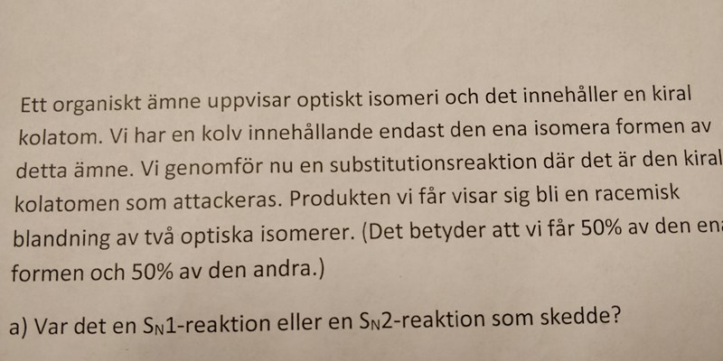 Vid en -reaktion vänder sig den reagerande molekylen ut-och-in som ett paraply i Göteborgsväder. Vid en -reaktion försvinner en s k lämnande grupp från den reagerande molekylen så att det bildas en karbokatjon. Vilken av dessa reaktionsmekanismer verkar mest troligt att den ger en blandning som består av lika delar av de båda optiska isomererna?