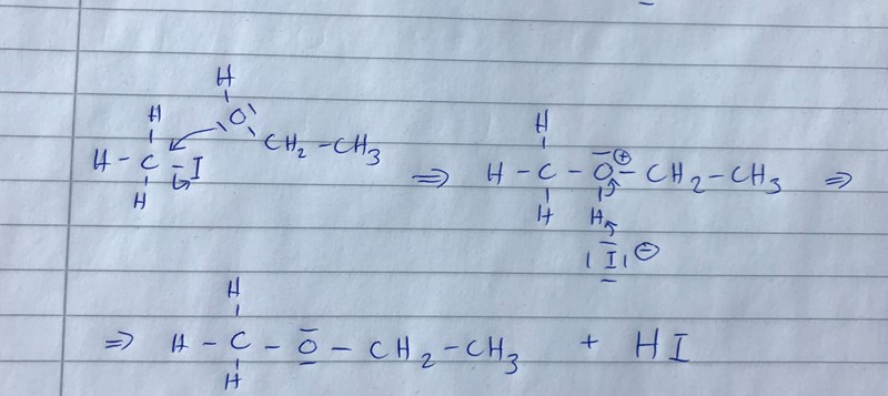Syftar du på steget högst upp till höger? Den negativt laddade jodidjonen bildar en kovalent binding till vätet, som "släpper" sin kovalenta bindning till syret. Bindingselektronerna blir kvar på syret.