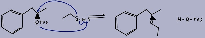I deluppgift a) så sker det en nukleofilattack av hydroxidgruppen från EtOH till tosylgruppen (som enl. uppgiften ska vara en bra lämnande grupp) och då blir stereocentrat inverterat. Så här har jag fått min lösning -->