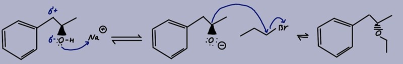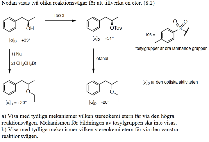 När det gäller deluppgift b) så är den lite klurigare. Från frågan så får vi veta att båda molekylerna kommer att vara enantiomerer då de har (+-) av samma optiska aktivitet. Dvs: i slutmolekylen i b) så ska C-O bindningen "peka utåt" i rymden, men jag är inte säker på hur mekanismen går till när Na tillsätts till substratet. Efter att natriumet är tillsatt och vi får en alkoxidgrupp så tänker jag att det borde väl bli en helt vanlig Williamsons etersyntes. Så långt har jag kommit på uppgift b) -->