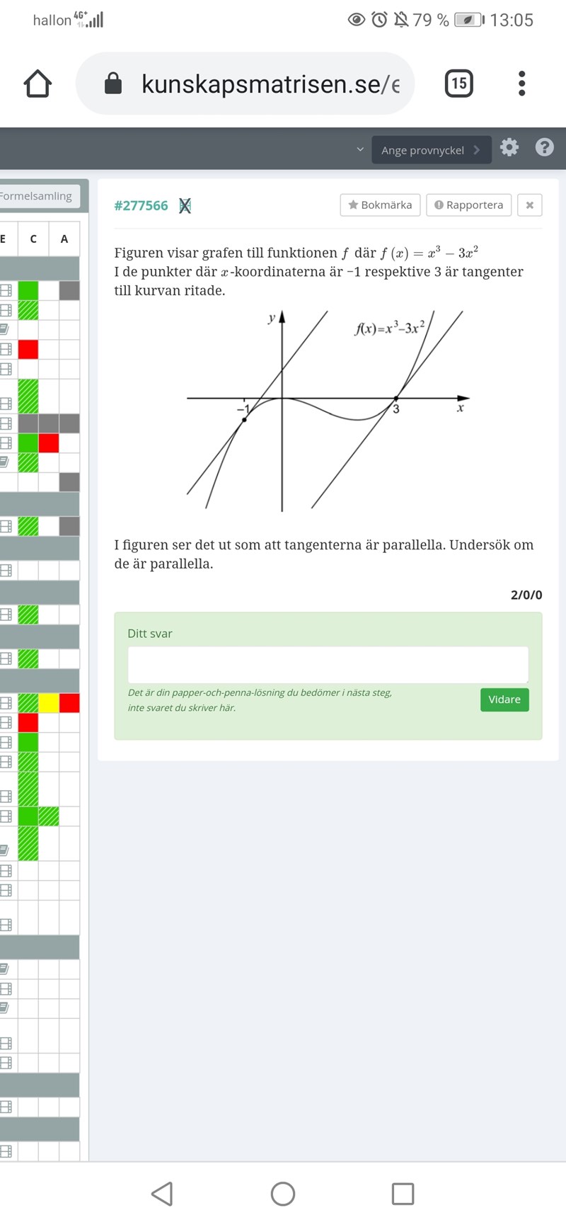 Tangentens lutning vid x = 3 är lika med f'(3)