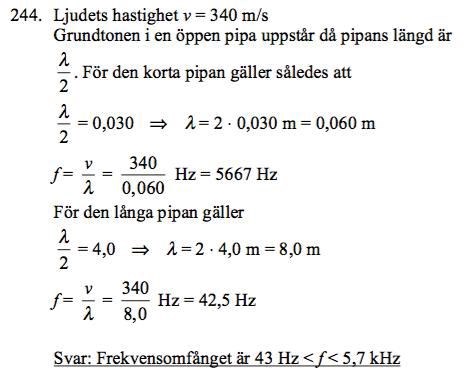 En orgel består av pipor av olika längd, som är öppna i båda ändarna. Längden av den kortaste och längsta pipan är 30 mm respektive 4 m. Hur stort är frekvensomfånget för dessa pipors grundtoner?