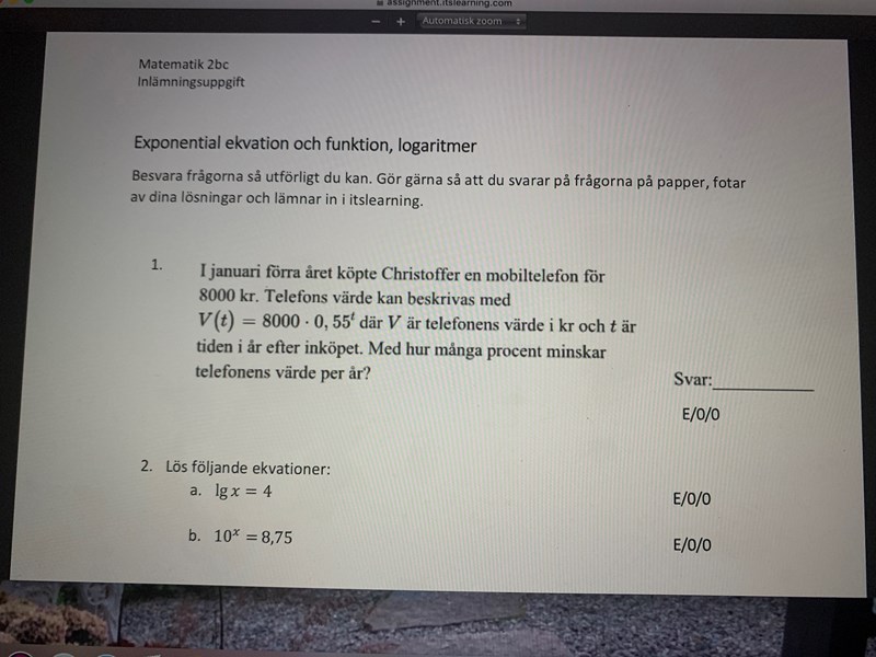 Efter 1 år (t=1) är den värd  8000·0,551            Räkna ut hur mycket det är