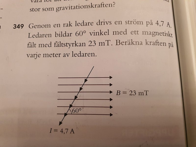Först tänkte jag att jag kunde komposantuppdela strömmen och ledaren var för sig så att båda dessa blir vinkelräta mot magnetfältsriktningen. Då får jag att F = B × sin(60°)I × sin(60°)l. Men svaret blir fel enligt facit.