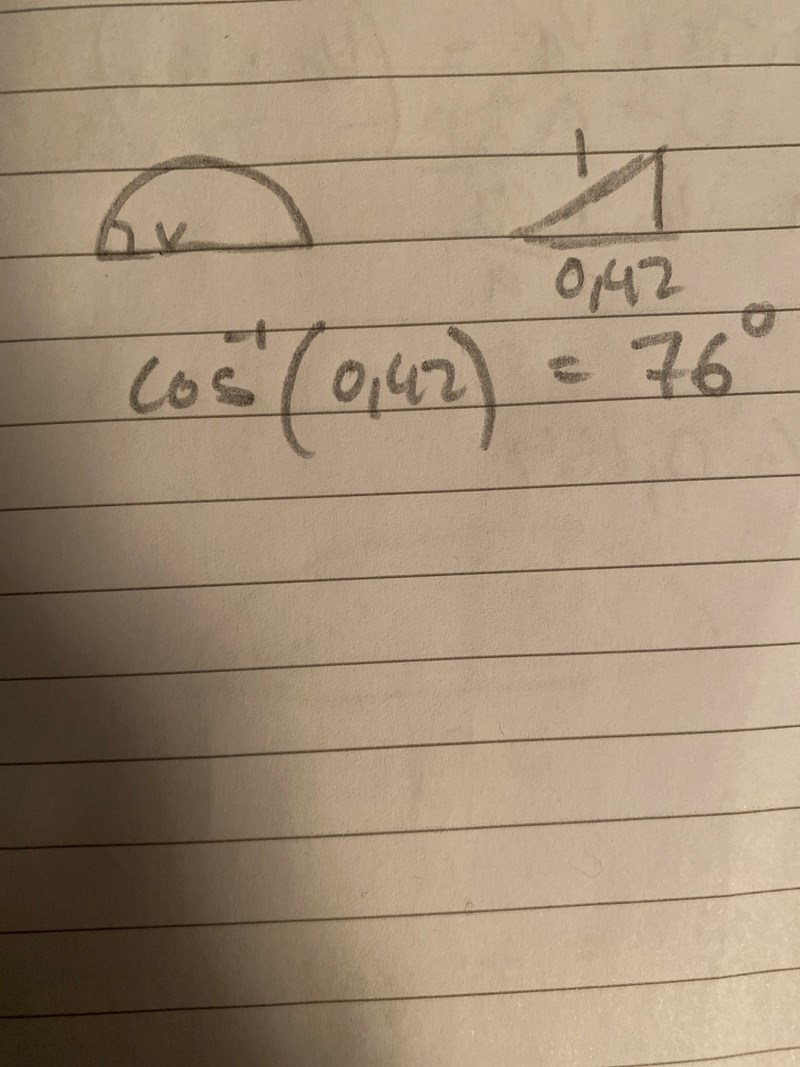 En kula kastat snett uppåt i en riktning som bildar vinkeln a med horisontalplanet. När kulan passerar banans högsta punkt är dess hastighet 42% av vad den var från början. Beräkna vilken a.