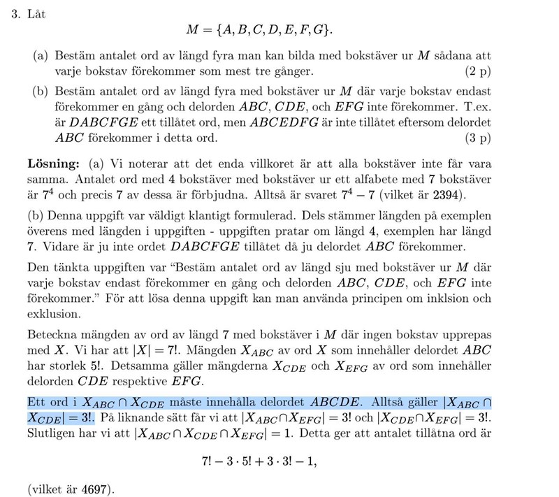 Skaft skrev:Det är samma tänk som jag presenterade i din andra tråd. Stycka upp ordet i olika delar (både delord och "fria" bokstäver), och räkna sen antalet permutationer av dessa. I det här fallet måste man komma ihåg att om både ABC och CDE ska finnas med i ordet, måste de sitta ihop som ABCDE, eftersom det bara finns ett C att använda. Så ordet ska bestå av de tre delarna "ABCDE", "F", "G".