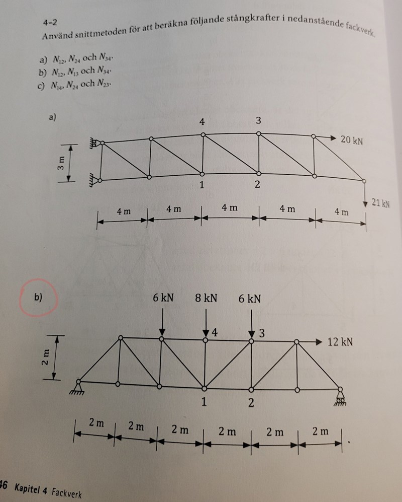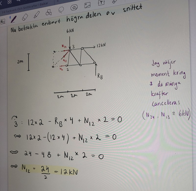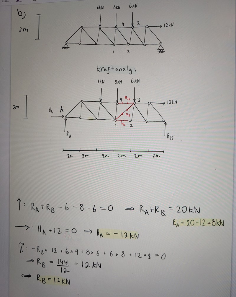 Jag behöver hjälp med att få ut N12. Facit får att N12 ska bli 24 kN. Men jag tror att mitt Rb är fel. Ser någon felet?