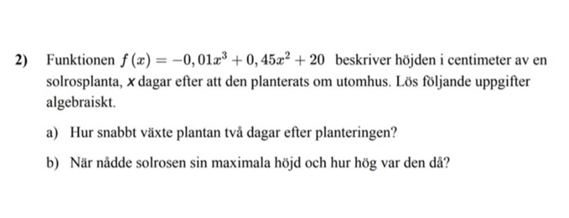 ”Hur hög blev solrosen”. För att besvara den frågan kvarstår det att sätta in x=30 i funktionen f(x) vilket ger ett svar på 155cm
