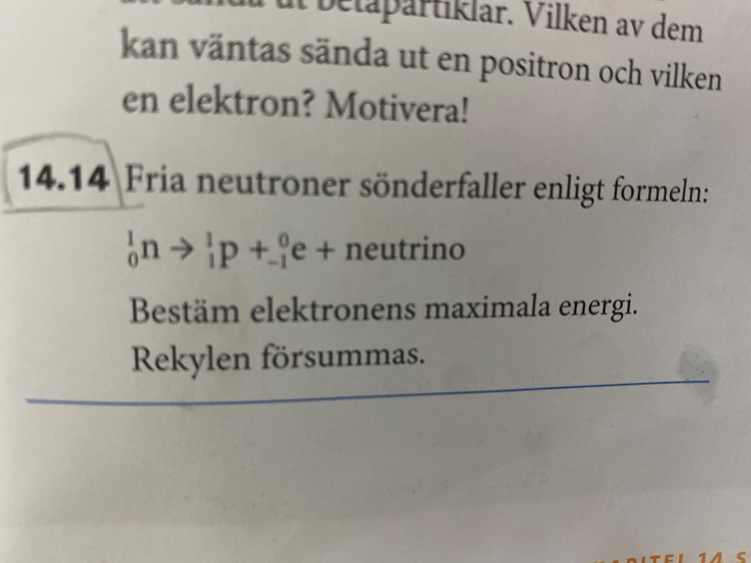 Det borde kanske stå "maximala kinetiska energi" istället för "maximala energi" så blir det lite tydligare. Och kanske även stå att den sönderfallande neutronen inte har någon kinetisk energi.