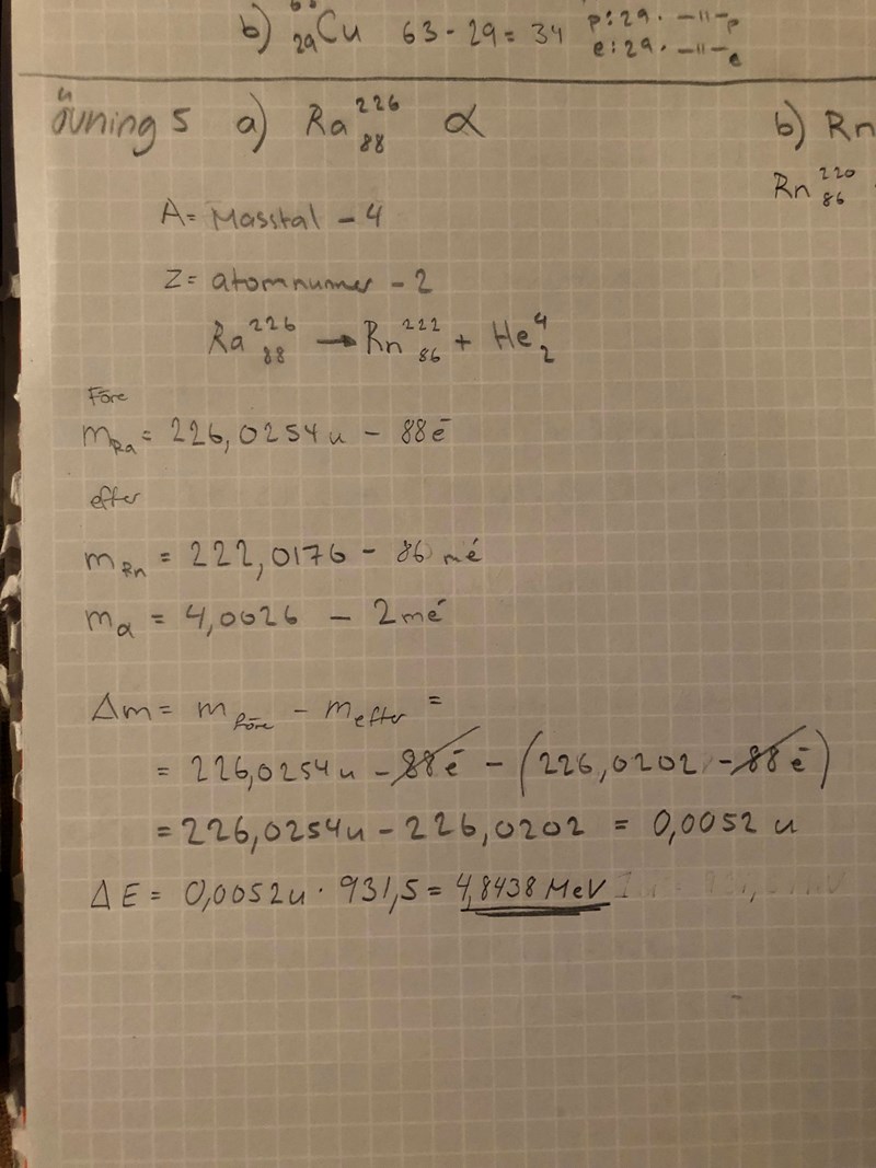 Edit: Så jag hade skrivit Mdotterkärna= massan för en Rn atom + 2 elektroner. Malpha= massan för en helium atom minus 2 elektroner. Så plus två på den första minus två på den andra så tar det ut sig. :)